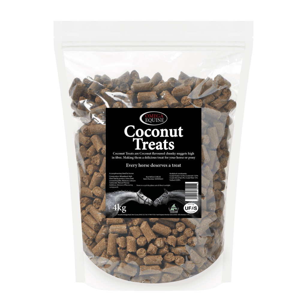 Omega Equine Coconut Treats are coconut-flavoured horse treats supplied in a 4kg bag, presented as chunky nuggets for rewarding and everyday treating.